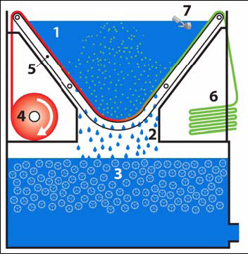 5. Vlies transportband. 6.Opvangruimte vervuild vlies.